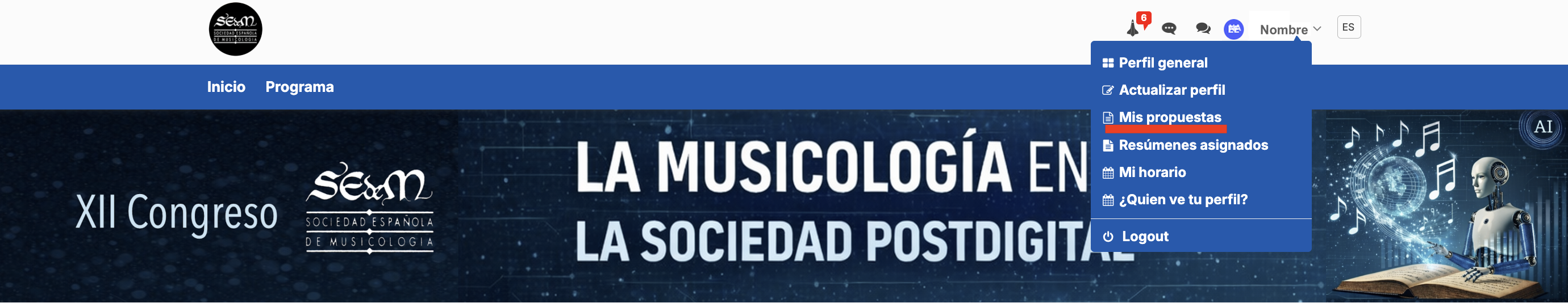 Una vez realizado el registro, el resumen y el resto de los datos se completan desde el apartado "Mis propuestas", en el panel desplegable que se abre al pinchar en la flecha encima de la cabecera, al lado del nombre de cada usuario: